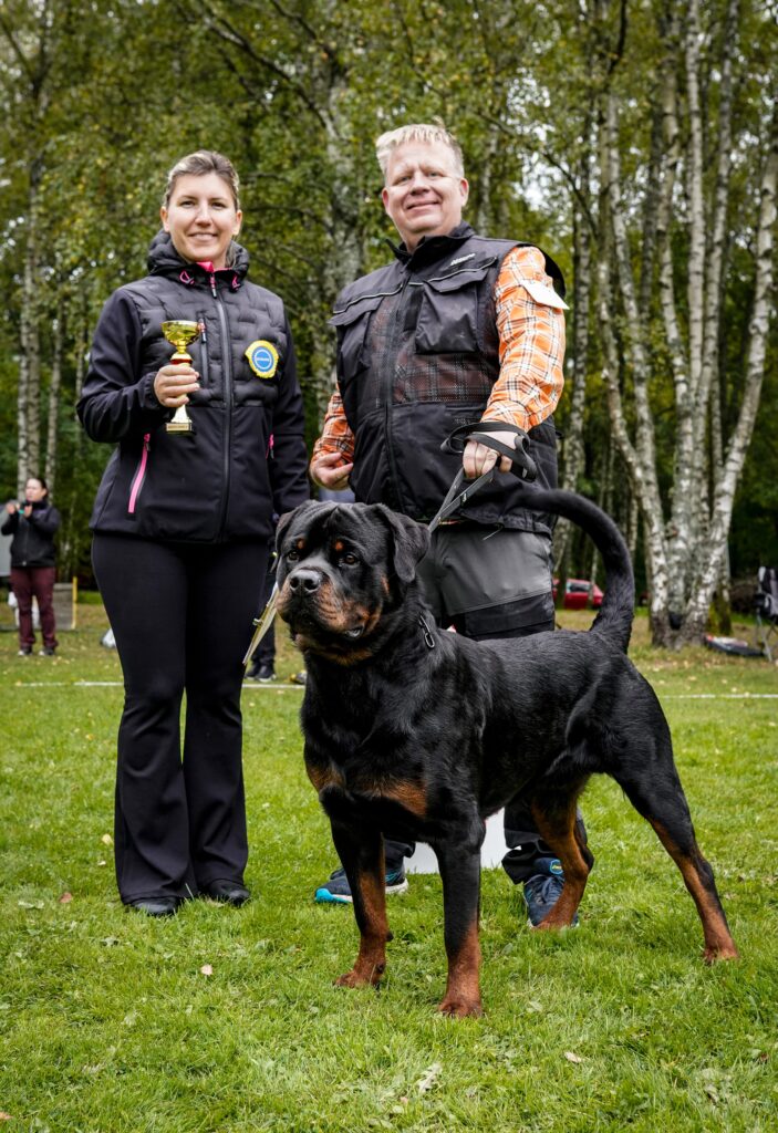 Rottweilerns rasstandard beskriver ”en kraftfull hund som är svart med rödbruna, klart avgränsade tecken och som trots det kraftiga helhetsintrycket ändå visar ädelhet och som särskilt väl lämpar sig som sällskaps-, tjänste-, räddnings- och brukshund”